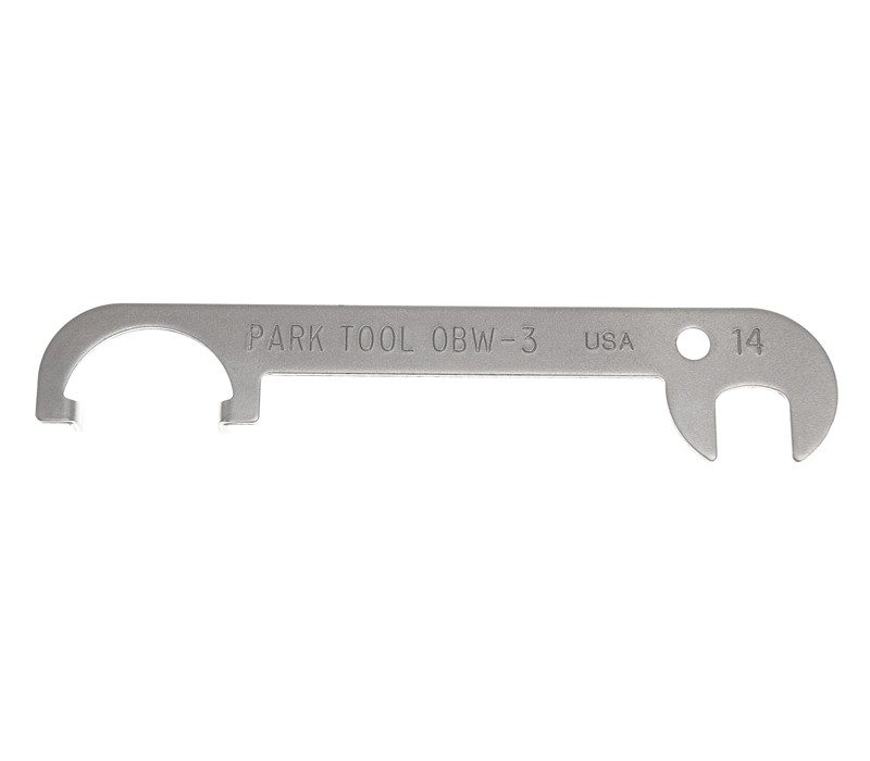 We call these our offset wrenches because of their unique design, which allows them to be used in tight places, such as centering caliper brakes. OBW-3 has a 14mm opening, and the other end fits into the tension springs to rotate the brake on its bolt.