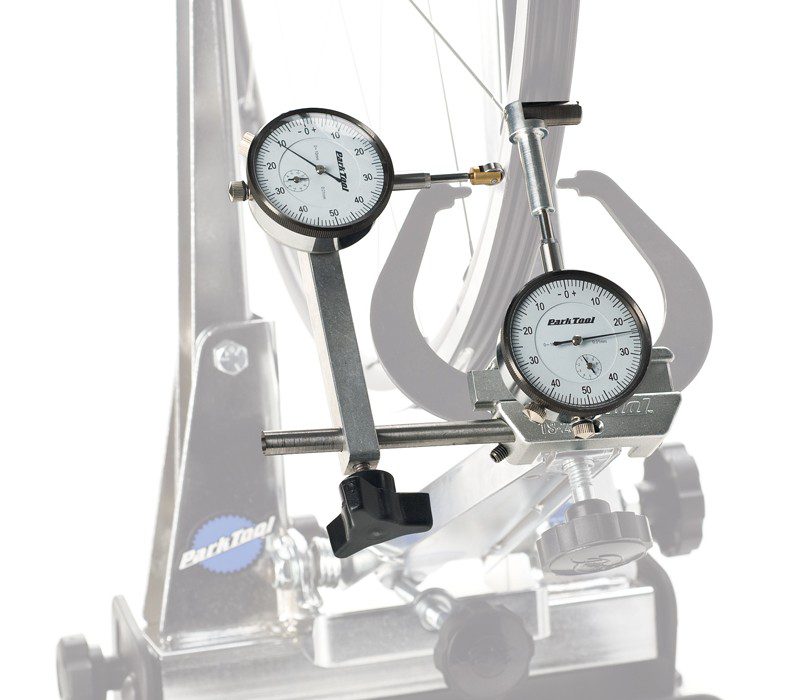 A dial indicator bracket and set that measures a wheel’s lateral and radial run-out to .01mm