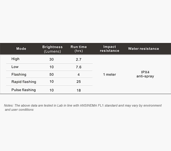 By using two rows of COB LED, TR50 provides broader lighting area and wider visibility angle while giving out 50 lumens for flashing and 30 lumens for constant on to increase visibility during your day and night riding